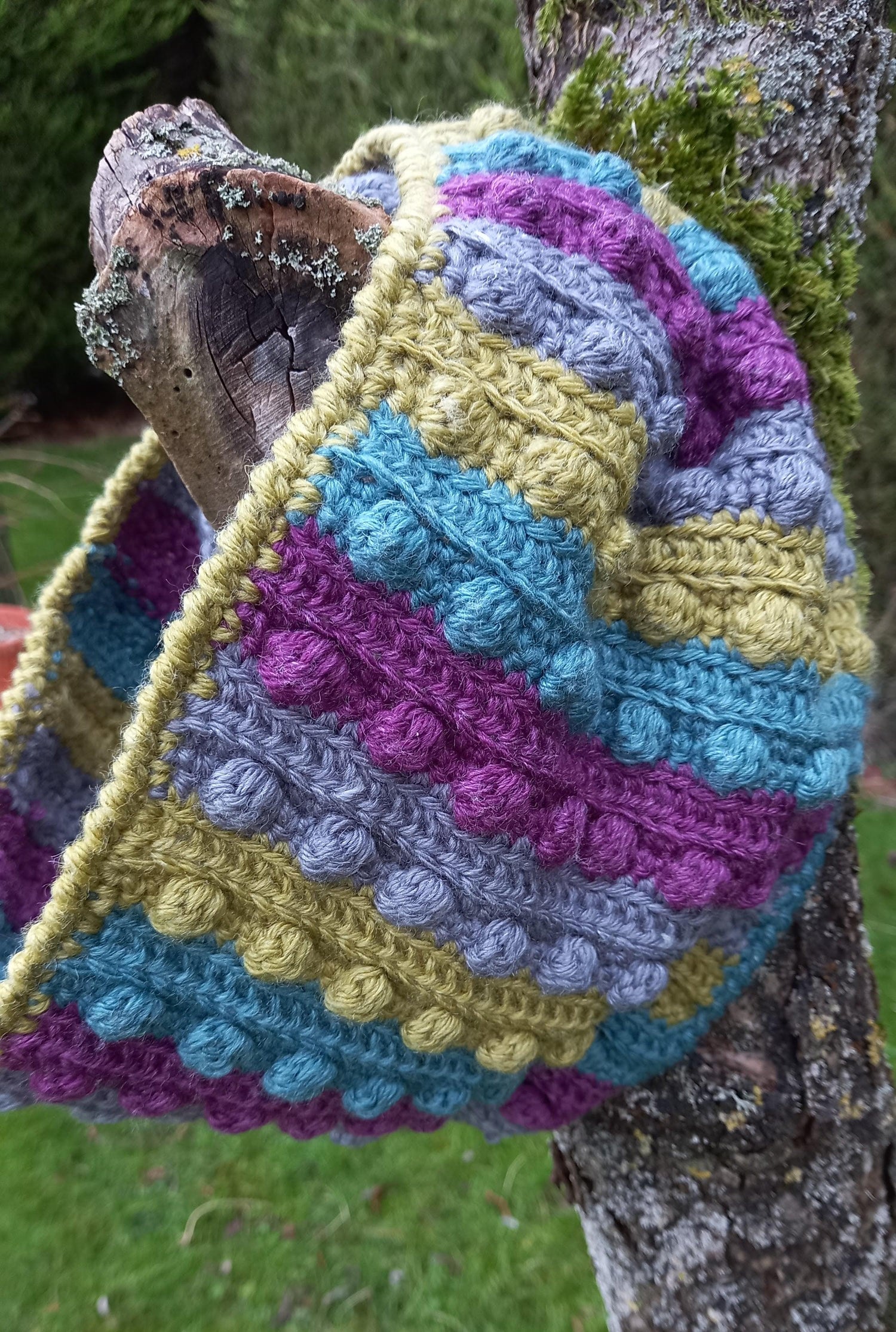 Techniques: Crochet, crab stitch, bobble, chain, double crochet, half treble crochet