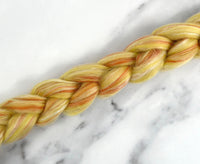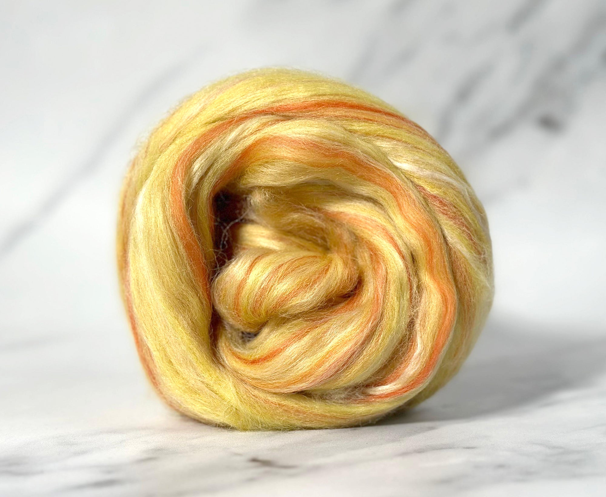 For this blend, we leaned into the golden, frothy decadence of a fresh-poured nog. Recycled wool and Corriedale wool in soft egg-yolk yellows form the base, while Seacell (a fibre made from seaweed) brings a silky lightness (think of it as the whipped top layer). To finish, Merino wool in warm cinnamon denotes the sprinkle of spice that gives eggnog its unmistakable flavour. Ideal for spinners and felters, this blend is surprisingly soft.