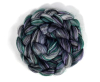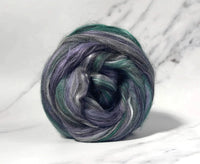 A magical mix of bamboo, corriedale, and sparkling stellina. Deep greens, rich purples with a strike of mythical sparkle. Perfect for spinning & felting.