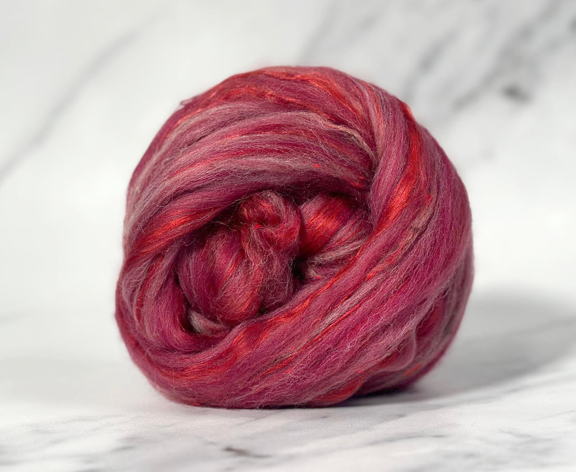 We created this blend as an ode to both the treat and the tradition. Merino wool in deep elderberry and mulberry shades forms a sumptuous base, inspired by the dark, syrupy tones of the sweet after soaking. The addition of our neppy wool blend brings bursts of colour. And for that unmistakable indulgence? Mulberry silk, dyed a festive red, gives the whole blend a glossy richness. The result is opulent with silky texture, just like the dessert that inspired it.
