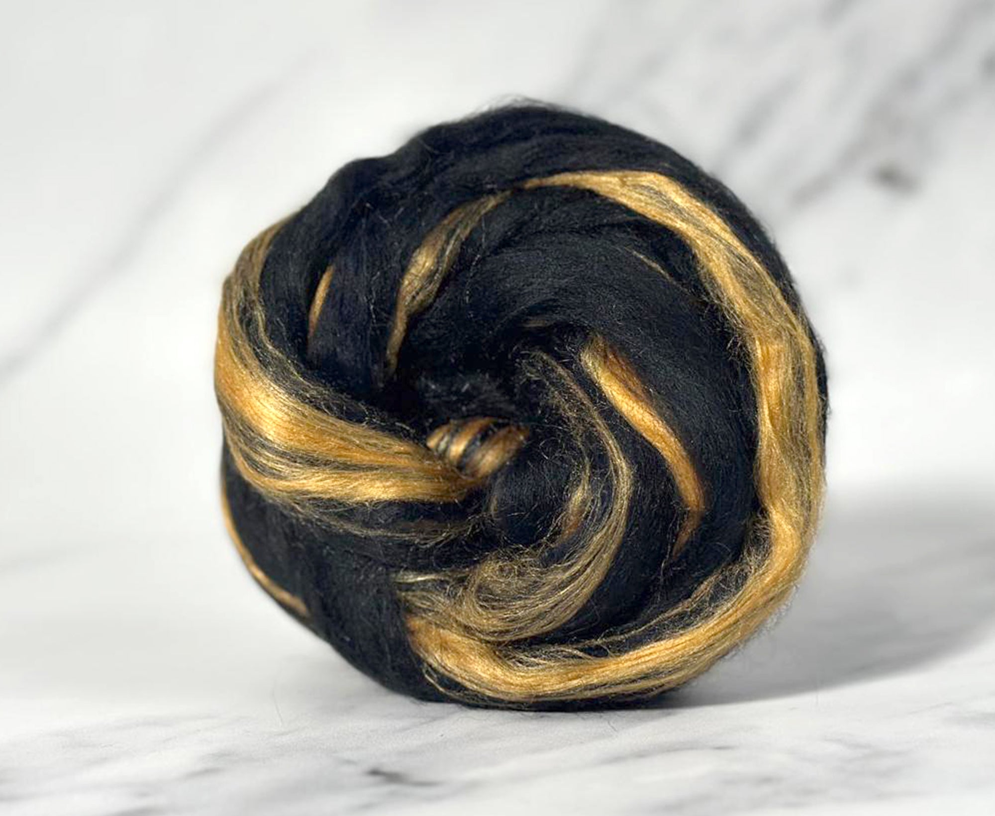 To honour this unusual holiday guest, we created a blend that’s full of character. Corriedale wool, dyed deep black, gives the base both strength and warmth, like the sturdy prune itself. Black bamboo fibre adds a slick, inky shine, while red Eri silk introduces subtle pops of festive colour, like little berries, or perhaps a tiny scarf on your dried-fruit friend.